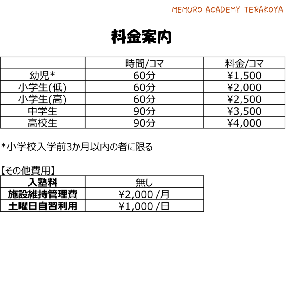 MEMURO ACADEMY TERAKOYA に固定の月謝・月額はございません。